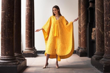 An astonishing golden outfit made from the silk of spiders has gone on display at London’s Victoria and Albert Museum.